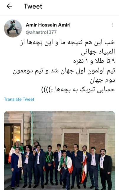 به گزارش ایران اکونومیست، در پانزدهمین المپیاد جهانی نجوم و اخترفیزیک (IOAA ۲۰۲۲) که در شهر کوتایسی گرجستان برگزار شد، مهدی استادمحمدی، سپهرسلامت، محمدمهدی عابدیان، فرهاد عزیزی سطری، سیدیوسف میریوسفی، سهند اسماعیل زاده، سهند اکرمی پور، آریا قنبری، آرسام مجد به مدال طلا و علیرضا اعلایی هره دشت به مدال نقره دست یافتند.