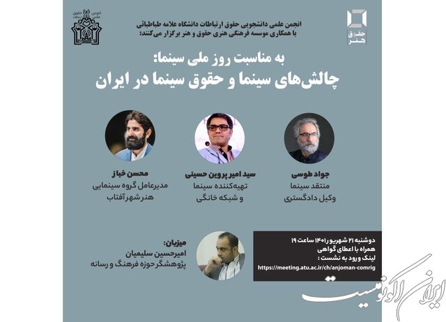 به گزارش باشگاه دانشجویان ایران اکونومیست، این جلسه به مناسبت روز ملی سینما و با حضور جواد طوسی (منتقد سینما و وکیل دادگستری)، سید امیر پروین حسینی (تهیه کننده سینما و شبکه خانگی) و محسن خباز (مدیرعامل گروه سینمایی هنر شهر آفتاب) دوشنبه 21 شهریور ساعت 19 برپا میشود.