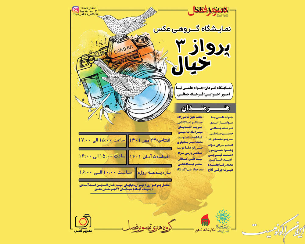 نمایشگاه گروهی عکس با عنوان «خیال» از ۲۵ مهر تا دوم آبان ماه از ساعت ۸ تا ۱۶ در نگارخانه کلک خیال به نشانی خیابان پیروزی، خیابان شکوفه، خیابان شهیدکاظمی، جنب بوستان گلزار، طبقه دوم فرهنگسرای اخلاق برپا میشود.