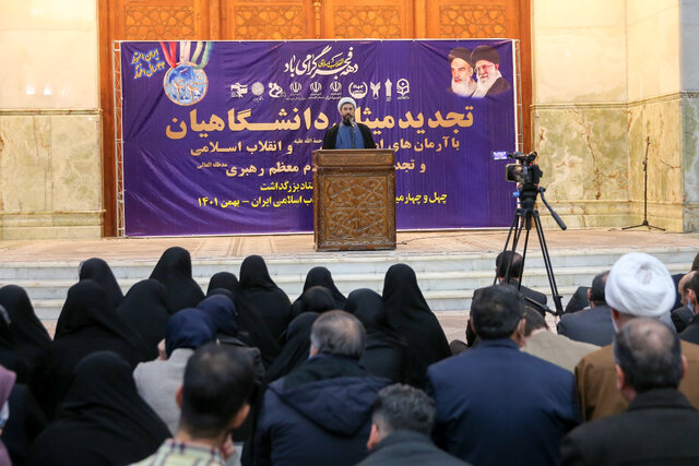 در آستانه چهل و چهارمین بهار پیروزی، ما دانشگاهیان ایران زمین سالروز پیروزی انقلاب اسلامی را به همه ملت شریف ایران، مسلمانان و مستضعفان جهان تبریک میگوییم و در این مکان مطهر به روح بلند و ملکوتی امام راحل(ره) و شهیدان همیشه حاضر درود میفرستیم و با آرمانهای انقلاب اسلامی و بنیانگذار کبیر آن تجدید میثاق کرده با مقام معظم رهبری امام خامنهای تجدید بیعت مینمائیم که تا آخرین نفس و تا ظهور آخرین منجی مهدی موعود(عج) انقلابمان و خون شهیدانمان را پاس بداریم.