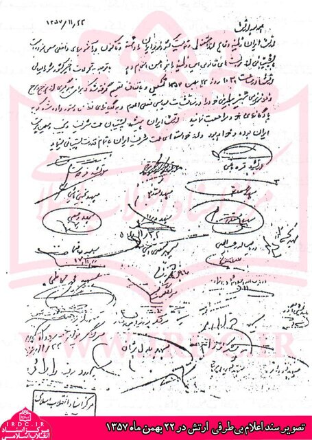 فرماندهان ارتش در این اطلاعیه تاکید کردند: «با توجه به تحولات اخیر کشور شورای عالی ارتش در ساعت ده و نیم امروز ۲۲ بهمن سال ۱۳۵۷ به اتفاق آرا تصمیم گرفت برای جلوگیری از هرج و مرج و خونریزی بیشتر، بیطرفی خود را در مناقشات سیاسی فعلی اعلام و به یگانهای نظامی دستور داد به پادگانهای خود مراجعت نمایند.