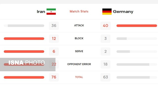 تیم آلمان در این بازی پر اشتباه ظاهر شد به طوری که ملی پوشان والیبال ایران ۲۲ امتیاز از اشتباهات حریف کسب کردند. در طرف مقابل، آلمان ۱۸ امتیاز از اشتباهات ایران به دست آورد.