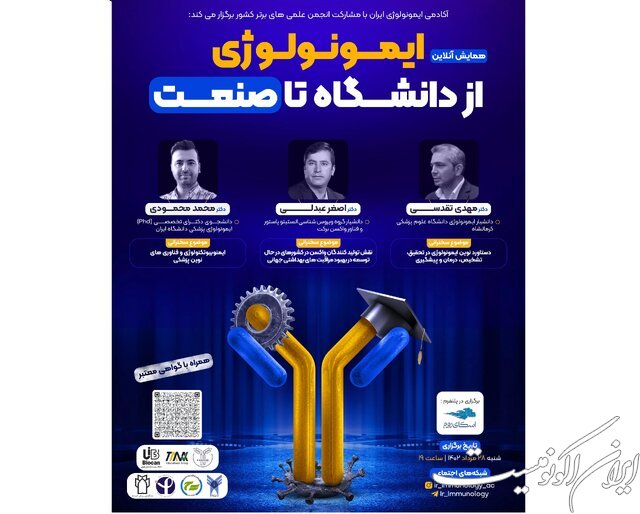 همایش «ایمونولوژی از دانشگاه تا صنعت» ۲۸ مرداد ماه ساعت ۱۹، با سخنرانی دکتر مهدی تقدسی ـ دانشیار ایمونولوژی دانشگاه علومپزشکی کرمانشاه، دکتر اصغر عبدلی ـ دانشیار گروه ویروسشناسی انستیتو پاستور و فناور واکسن برکت و دکتر محمد محمودی ـ دانشجو دکترای تخصصی بهصورت آنلاین در فضای اسکای روم برگزار میشود.