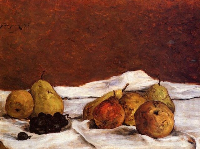 «پل گوگن» برخلاف «گوستاو کوربه» از زیباییشناسی رئال فاصله گرفت. هرچند نقاشی «گلابی و انگور» تا حد بسیار زیادی با دیدگاه واقعگرایانه خلق شده است، چراکه «گوگن» این نقاشی را در اوایل دوران فعالیت هنر خود خلق کرد.