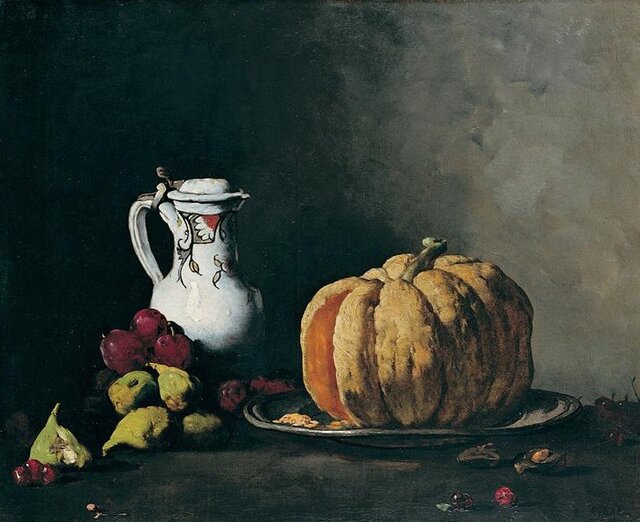 «تیودل ریبوت» شیفته نقاشی کردن طبیعت بیجان و آشپزخانه بود. او این نقاشی طبیعت بیجان پاییزی را با الهام از سبک رئال «گوستاو کوربه» خلق کرد تا طبیعت را همانطور که هست به نمایش بگذارد و از کمالگرایی اجتناب کند که معمولا این نگاه به تصویر کشیدن کدوتنبل و ... را منجر میشود.