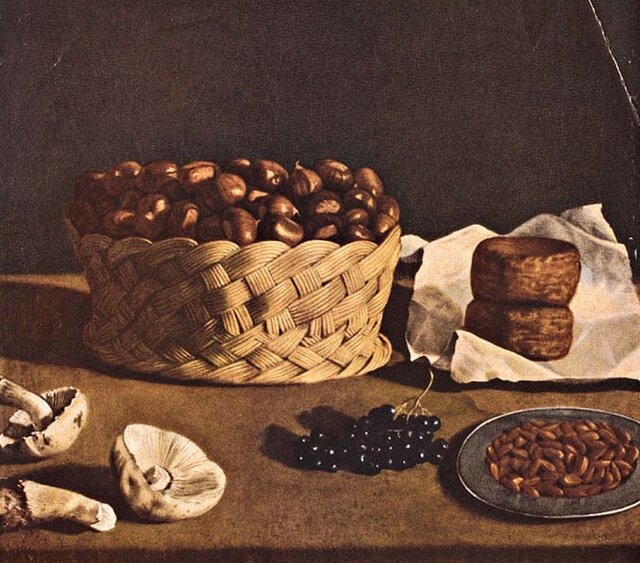 سبدی از شاهبلوط، پنیر، قارچ و میوه