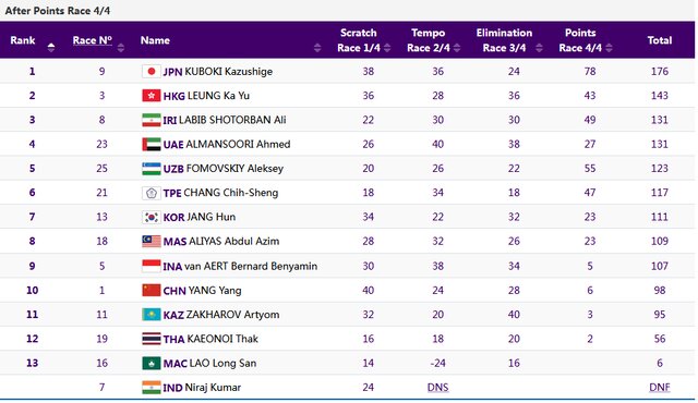 ۱۴ رکابزن در ماده اومنیوم به رقابت پرداختند که رکابزن هند مسابقه را تمام نکرد.