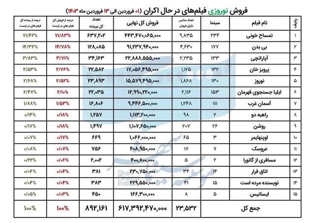 بر اساس این گزارش، اکران فیلم‌ سینمایی «تمساح خونی» از ۱۶ اسفند ۱۴۰۲ آغاز شد و تا ۱۳ فروردین به فروش ۶۵ میلیارد و ۹۰۶ میلیون تومان رسید. همچنین اکران فیلم‌های سینمایی «بی‌بدن»، «آپاراتچی»، «نوروز» و «آسمان غرب» از ۲۳ اسفند ۱۴۰۲ آغاز شد که از این تاریخ تا ۱۳ فروردین «بی‌بدن» به فروش بیش از ۱۰ میلیارد و ۴۸۵ میلیون تومان، «آپاراتچی» به فروش بیش از ۲ میلیارد و ۶۵۳ میلیون تومان، «نوروز» به فروش بیش از یک میلیارد و ۸۲۶ میلیون تومان و «آسمان غرب» به فروش بیش از ۹۵۷ میلیون تومان رسیدند.