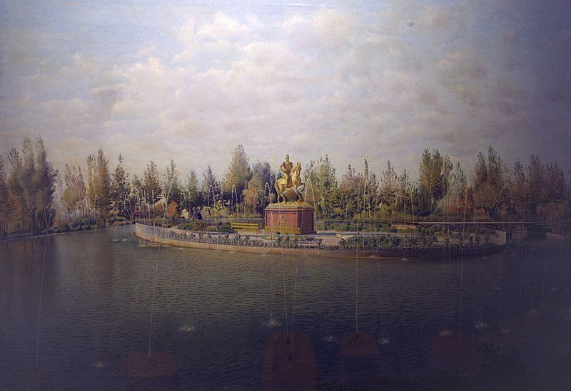 این اثر روی کرباس و در سال ۱۲۶۷ خورشیدی کشیده شده است. نقاشی، منظرهای از میدان باغشاه را نشان میدهد که تندیس ناصرالدین شاه سوار بر اسب، در میان آن است.
