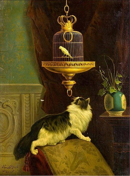 تابلوی «گربه و قفس قناری» اثر محمد غفاری، معروف به کمالالملک در سال ۱۳۰۸ هجری قمری در ابعاد ۶۱ در ۴۷ سانتیمتر، با رنگروغن روی بوم اجرا شده است و هماکنون در کاخ گلستان تهران نگهداری میشود.